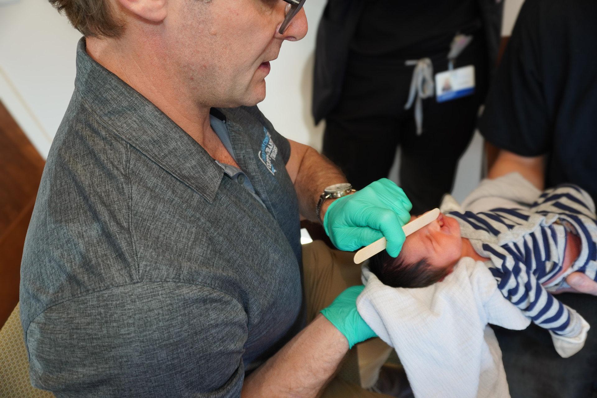 Much like cleft lip patients, children born with a cleft palate are assessed at birth. Following this, a feeding evaluation is also performed to determine if any special aids, such as syringes, are needed to ensure the child is taking in nutrients. Then, at around 12-16 months, the palate repair is done. Children are also recommended to a speech therapist at this time, and it is common for tubes to be placed in the ears, as well.